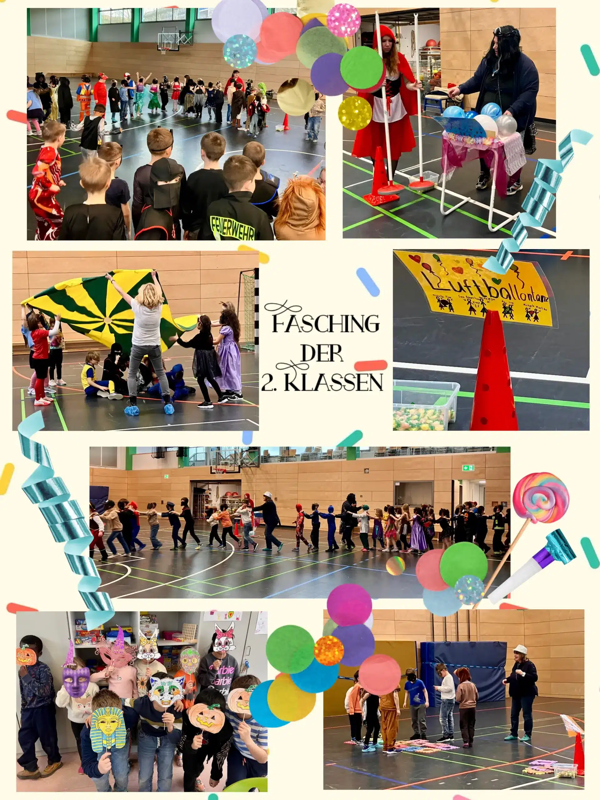 Unsere Zweitklässler hatten viel Freude beim Fasching in der Turnhalle. Gemeinsam mit ihren Erzieherinnen eröffneten sie das Fest mit einer fröhlichen Polonaise durch die Halle. Viele kreative und lustige Stationen luden zu spannenden Aktivitäten ein. Es wurde getanzt, geheiratet oder Freundschaften gestärkt. Bunte Kostüme und ausgelassene Stimmung, machten das Fest zu einem unvergesslichen Erlebnis.