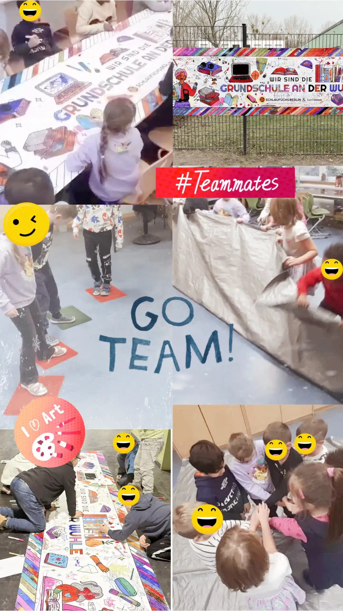 Unsere Erstklässler hatten die Gelegenheit, gemeinsam mit Schlaufuchs Berlin an verschiedenen Kooperationsspielen teilzunehmen. Diese Aktivitäten förderten nicht nur den Teamgeist, sondern machten auch viel Spaß. Zum Abschluss gestalteten die Kinder mit Unterstützung einiger Drittklässler einen farbenfrohen Banner, der ihre kreativen Ideen und die Zusammenarbeit widerspiegelte.