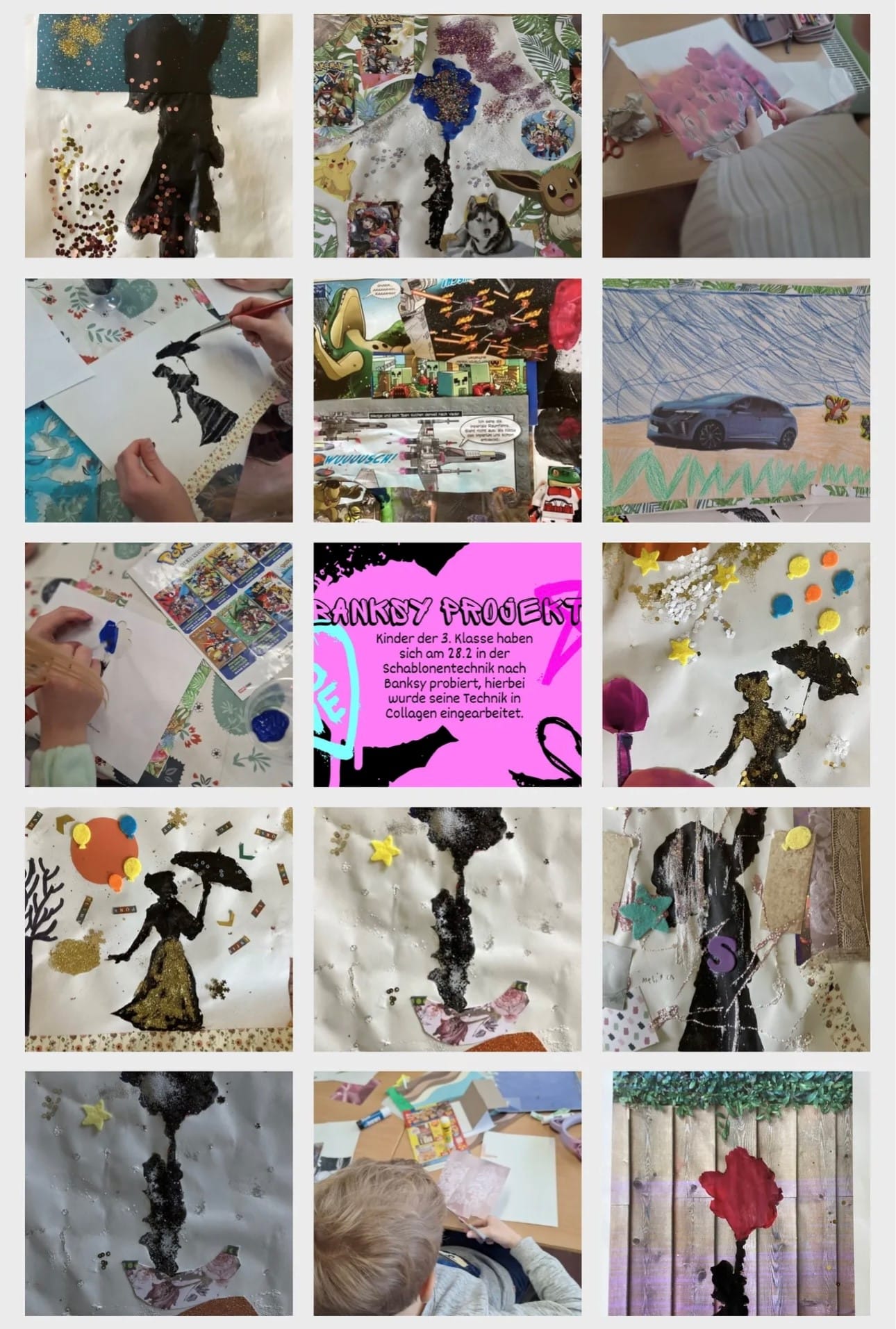 Im Rahmen unserer Kultur- und Medienarbeit haben wir am Freitag, den 28.02.25 ein kreatives Angebot in Klasse 3 durchgeführt. In diesem haben wir uns mit dem Künstler Banksy und seiner Schablonentechnik beschäftigt. Diese haben wir in Fotocollage eingearbeitet. Die Werke der Kinder sind in Originalgröße im Schaukasten vor der Bibliothek zu finden.