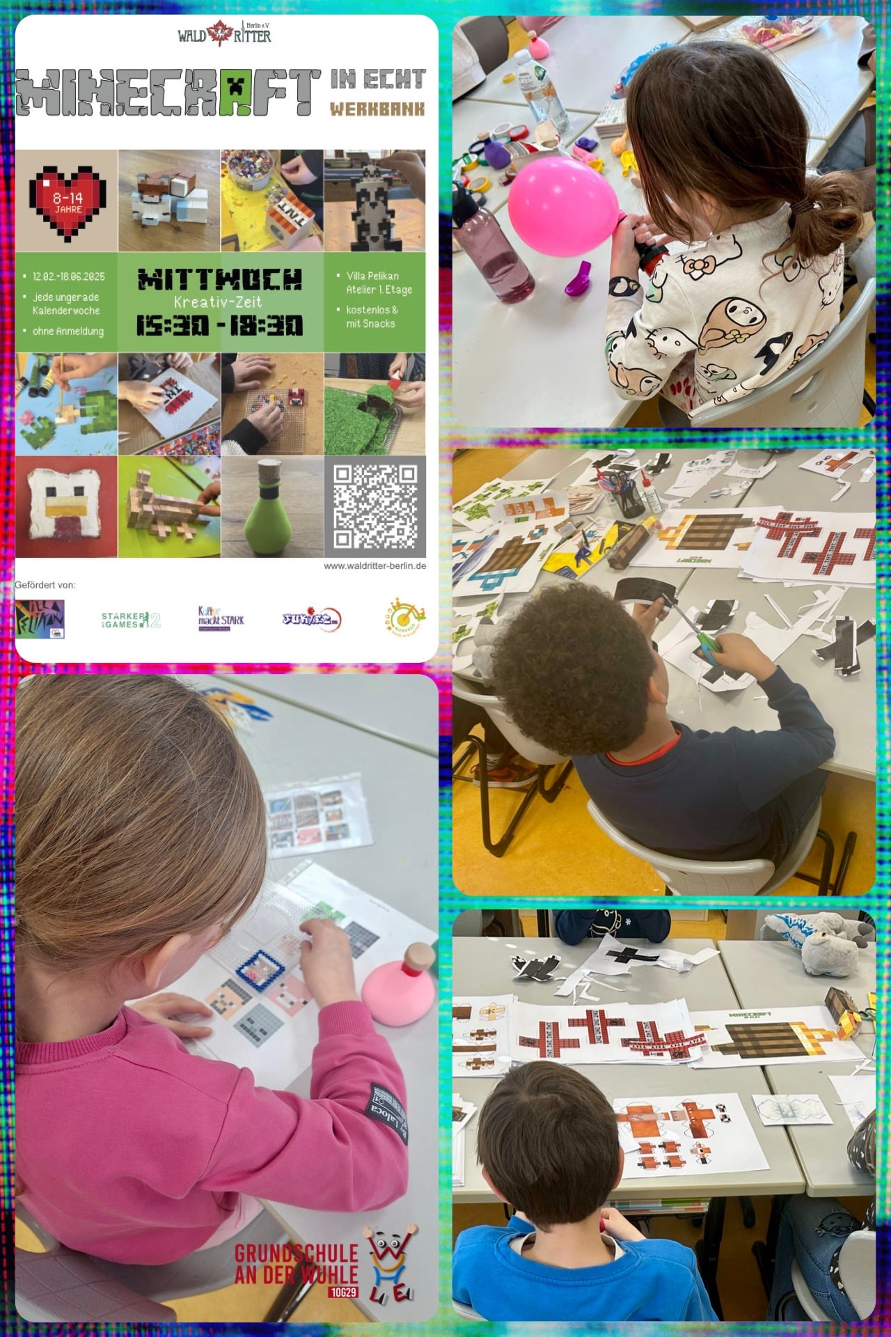 Dank des Engage­ment von Waldrit­ter Berlin e.V. kon­nten wir ein span­nen­des und kosten­freies Pro­jekt für unsere Drit­tk­lässler stat­tfind­en lassen. Bei „Minecraft in echt“ kön­nen die Kinder in ein­er kreativ­en Umge­bung span­nende Ange­bote ent­deck­en und gemein­sam ler­nen, was eine tolle Ergänzung zum Schu­lall­t­ag ist.